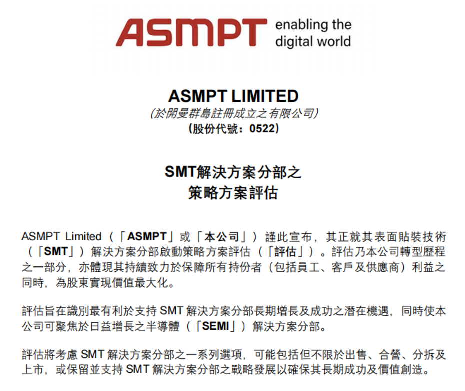 近日,全球半导体封装设备龙头ASMPT宣布计划剥离旗下SMT业务,此举被官宣解读为公司聚焦半导体核心赛道、优化资产结构的关键动作。但是众所