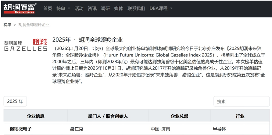 2026年1月,胡润研究院发布《2025胡润未来独角兽:全球瞪羚企业榜》,视频处理芯片(VPU)定义者、全球领先视频处理解决方案创新者——镕铭...