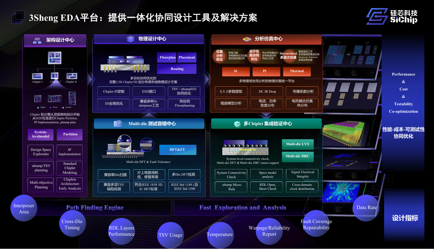 · 物理设计中心:具备3D布局布线、TSV-微凸点协同规划、热驱动布线以及中介层-RDL联合设计等能力,支持Chiplet-Interposer-Package协同设计,解决传统工具碎片化设计问题;