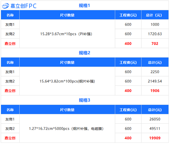通过与2家友商的价格对比发现:嘉立创FPC四层板在工程费和总价上均占优势,相同规格下定制成本可直降30%-50%。相同资料报价情况如下: