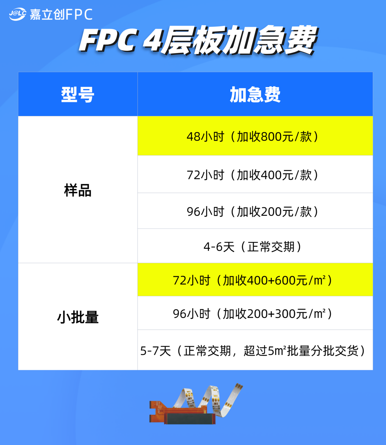 对于研发打样和量产补单等紧急需求,嘉立创FPC四层板也有多种灵活交期方案,最快48小时可交付。如客户有需求,我们也可加速到24小时交付!