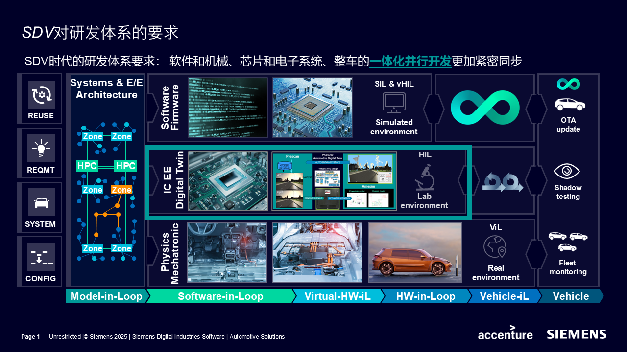 为应对软件定义汽车(Software-Defined Vehicles,SDV)带来的研发模式变革,西门子EDA创造性地推出了基于“全面数字孪生”+“软件左移开发”的全面解决方案,助力客户将行业挑战转化为发展机遇,显著提升创新效率、加快产品上市节奏,并有效降低研发投入。