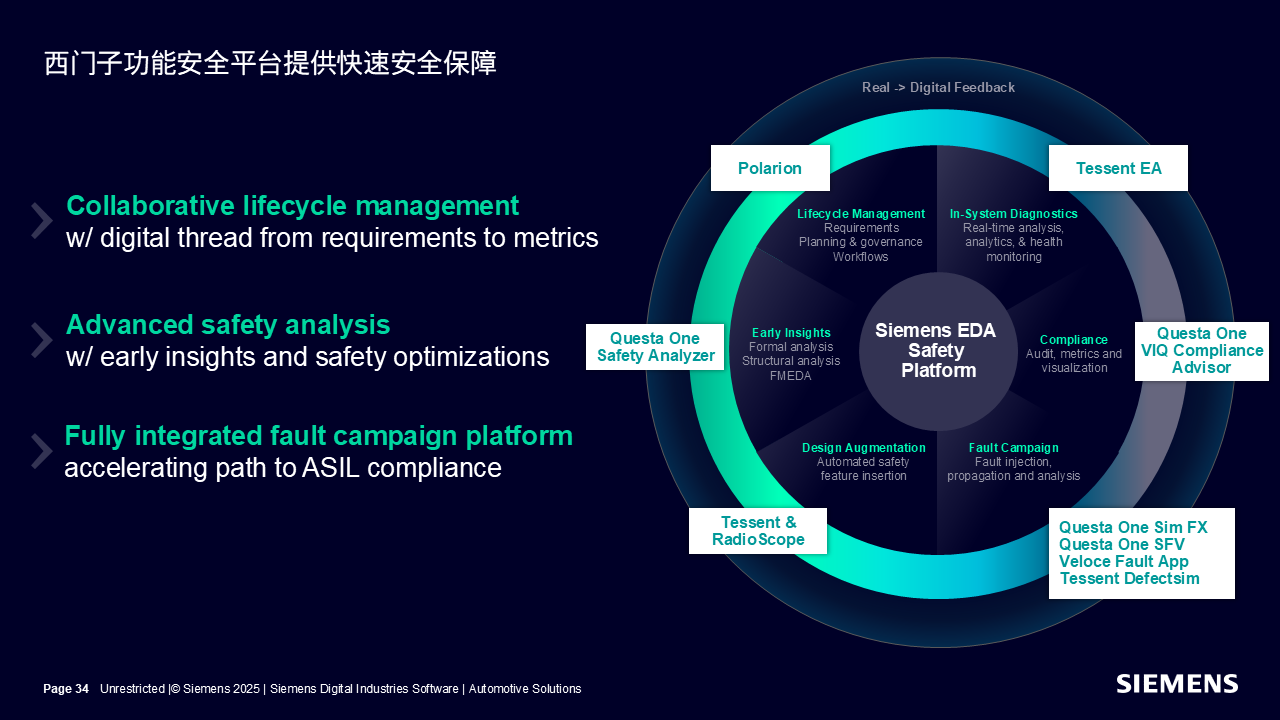 西门子EDA全面安全方案平台,构建了覆盖汽车芯片安全的全流程:贯穿芯片全生命周期的管理能力、早期的功能安全分析、Design for Safety的电路结构插入,Fault仿真及分析,提出芯片合规方面的改进建议,以及芯片内安排建库IP解决方案,可以支持在系统上任意时刻进行实时的诊断分析。凭借上述全流程能力,该平台得以全方位保障汽车芯片在自动驾驶、智能座舱等各类复杂场景下的安全稳定运行,为汽车电子系统筑牢可靠的安全防线。