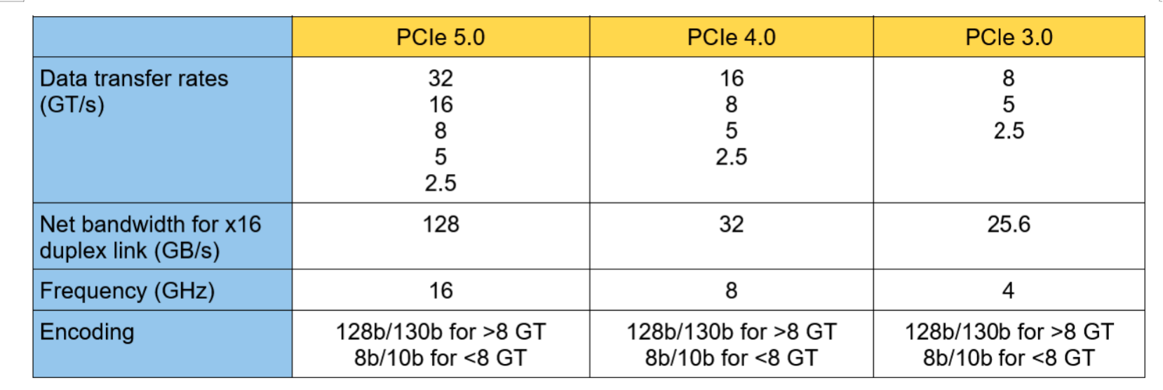 与PCIe 3.0的8 GT/s相比,PCIe 5每通道的吞吐量提高了四倍。