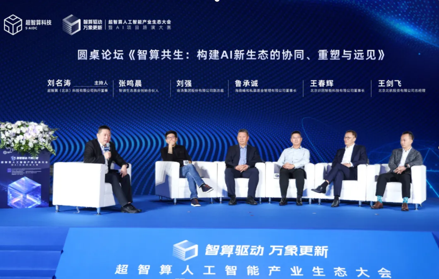 圆桌论坛环节,超智算科技执行董事刘名涛主持开展了以《智算共生:构建AI新生态的协同、重塑与远见》的讨论,与北京北航投资有限公司总经理王剑飞、商汤集团股份有限公司副总裁刘强、峰和资本董事长鲁承诚、智谱生态基金创始合伙人张鸣晨、北京识因智能科技有限公司董事长王春辉围绕“算力如何驱动产业创新”、“AI技术商业化路径”及“生态构建的关键要素”等核心议题展开深度对话,观点交锋。