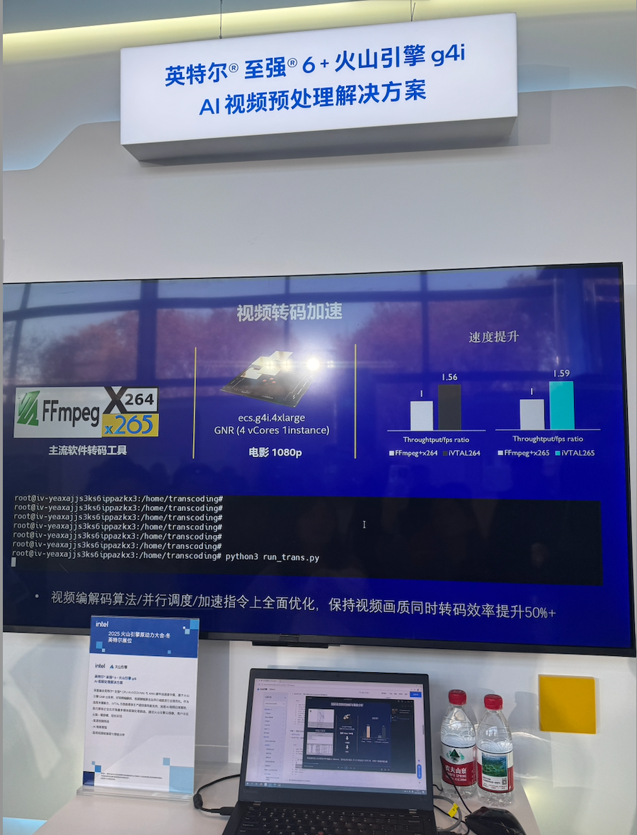 第二个关键点,是双方把“视频AI链路”做成了可落地的、CPU可承担的全流程方案。基于英特尔® 至强® 6 性能核处理器与火山引擎g4i实例,双方围绕视频编解码、AI视频增强、并行调度进行了系统级优化,并通过AVX-512 VNNI、AMX以及英特尔® iVTAL智能媒体软件库形成软硬协同,让用户在云端通过镜像一键部署就能完成转码、增强、抽帧与智能分析等任务。