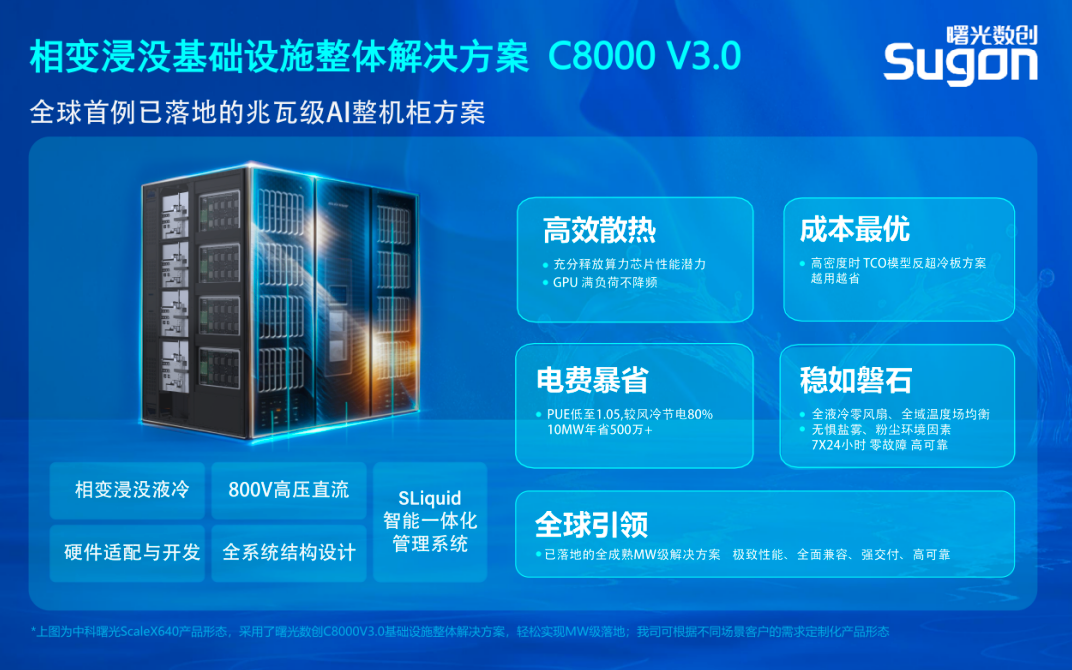 4月8日,曙光数创在“液冷聚能·智算向新”2026战略发布会上,正式发布全球首个MW级相变浸没液冷整机柜及其基础设施整体解决方案(C8000 V3.0)。