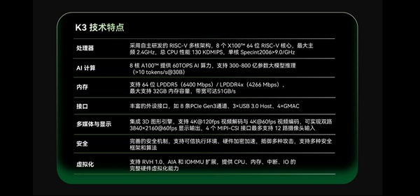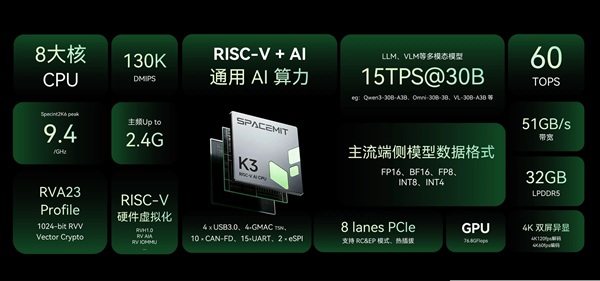 作为这一组合的硬件底座,K3 是进迭时空的新一代 RISC-V AI CPU 旗舰处理器,具备 130 KDMIPS 通用算力 与 60 TOPS AI 算力,可高效运行 300-800 亿参数大模型,并支持完整虚拟化及 PCIe、USB 等主流外设接口。