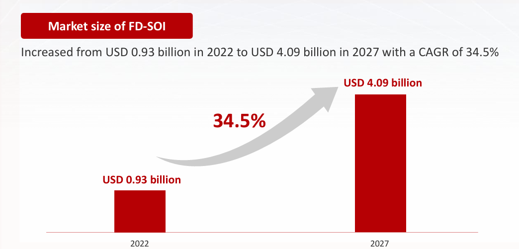在业界的争相关注和投资下,FD-SOI已获得广泛的市场关注。戴伟民在分享中指出,FD-SOI的市场规模预计将从2022年的9.3亿美元增加到2027年的40.9亿美元,复合年增长率为34.5%。可见FD-SOI市场潜力巨大。
