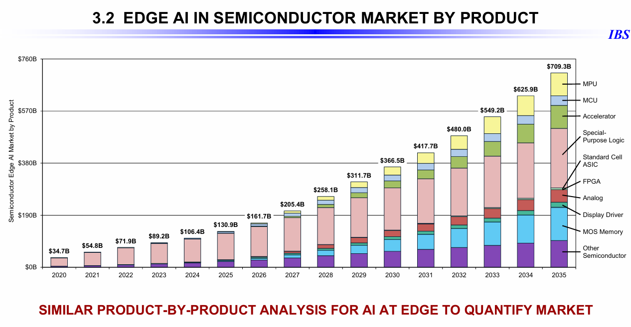 AI在半导体市场中的占比持续提升。以加速器、专用逻辑等AI核心关联品类为例,其AI相关需求的占比逐年扩大;边缘AI的细分市场同样亮眼,2035年MPU、MCU、加速器的边缘AI市场规模将分别较2020年增长10倍以上,成为拉动半导体需求的重要力量。