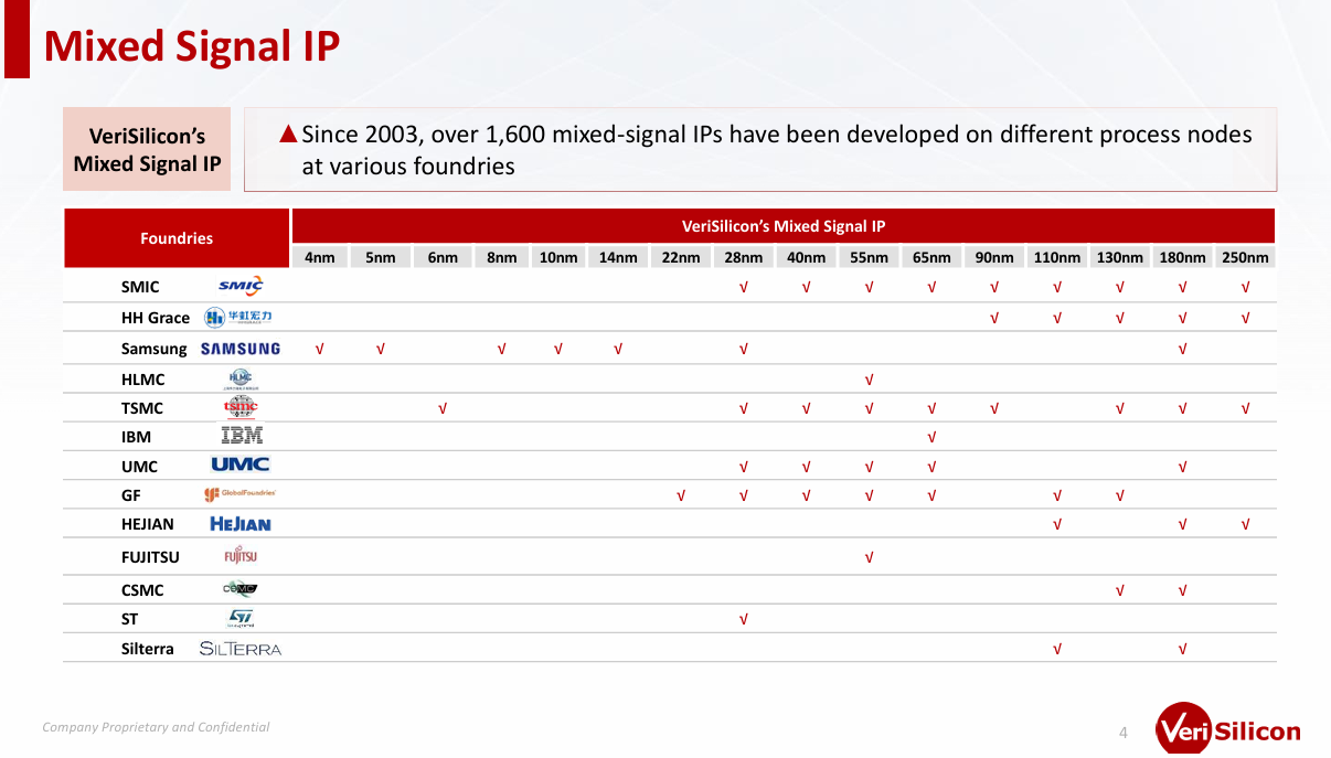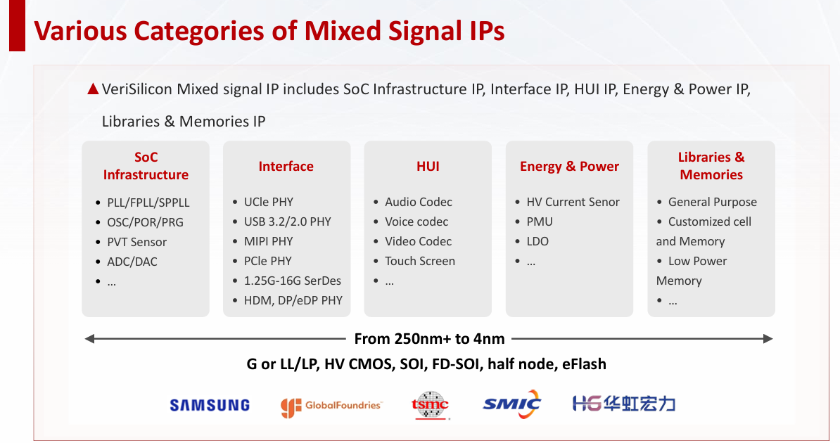据介绍,芯原基于FD-SOI工艺的混合信号IP平台是其核心优势之一。自2003年起,公司已在全球多家主流晶圆厂的不同工艺节点上开发了超过1600个混合信号IP,覆盖从250nm到先进4nm的广泛制程,合作厂商包括三星、格罗方德、中芯国际、华虹宏力、台积电等。这一平台涵盖SoC基础设施IP、接口IP、人机交互IP、能源与电源管理IP、存储与库IP等五大类别,包括PLL、ADC/DAC、MIPI PHY、USB PHY、SerDes、音频编解码器等关键IP,为客户提供了丰富且经过硅验证的选择。