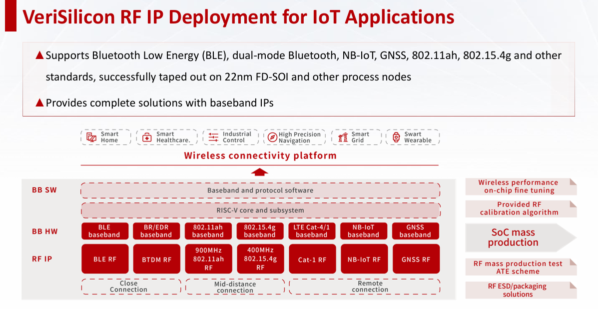 在物联网领域,芯原的RF IP组合尤为突出。其22nm FD-SOI射频IP平台支持包括蓝牙低功耗(BLE)、双模蓝牙(BTDM)、Wi-Fi 6(802.11ax)、NB-IoT、GNSS、802.11ah、802.15.4g等多种无线标准,并提供完整的基带IP与协议栈软件,形成了“RF+BB+SW”的完整解决方案。