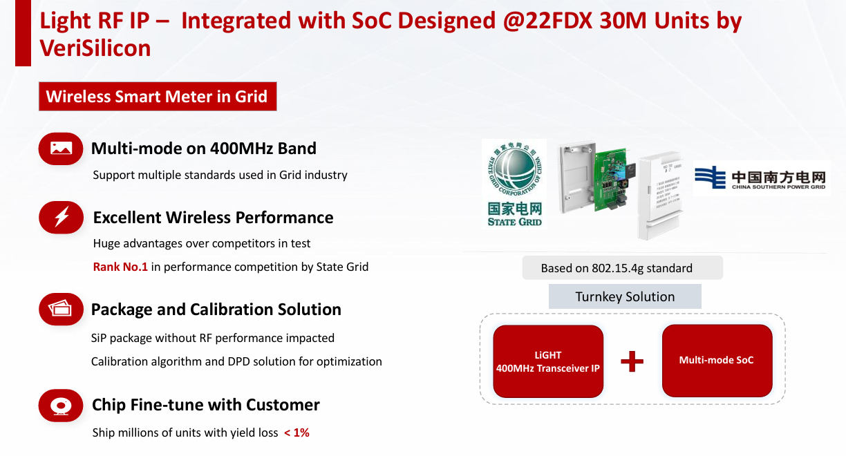 例如,其BLE RF IP在GF22FDX工艺下实现0.8V核心电压,功耗低至TX 9mW、RX 7mW,已成功集成于多家客户的SoC中。而基于802.15.4g标准的400MHz轻量级收发器IP,更是在国家电网的智能电表项目中以优异性能获得认可,已量产超3000万颗,良率损失低于1%。