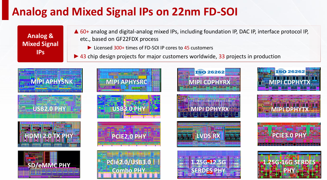 对此,芯原积累了深厚的技术底蕴,推出了大量高性能、低功耗的模拟与接口IP,并多次实现量产,显示出其在FD-SOI技术上的成熟度和可靠性。