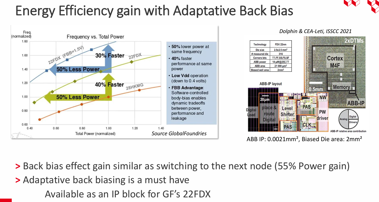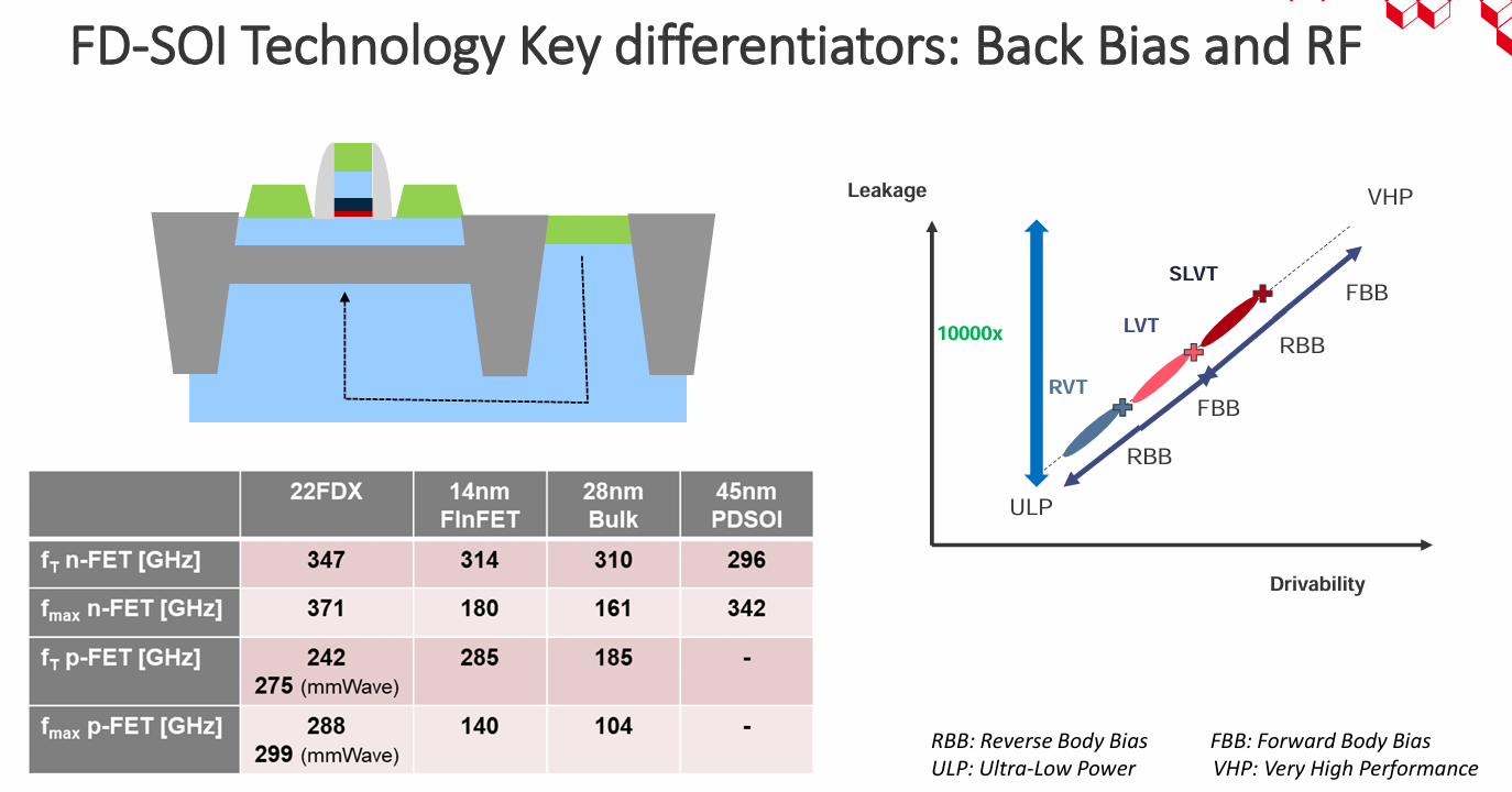 Martin Gallezot指出, FD-SOI技术的核心优势体现在背偏压(Back Bias)与射频(RF)性能两大差异化特性上。通过动态调整晶体管的体偏压,可以在不改变电路结构的情况下实现功耗与性能的灵活平衡。