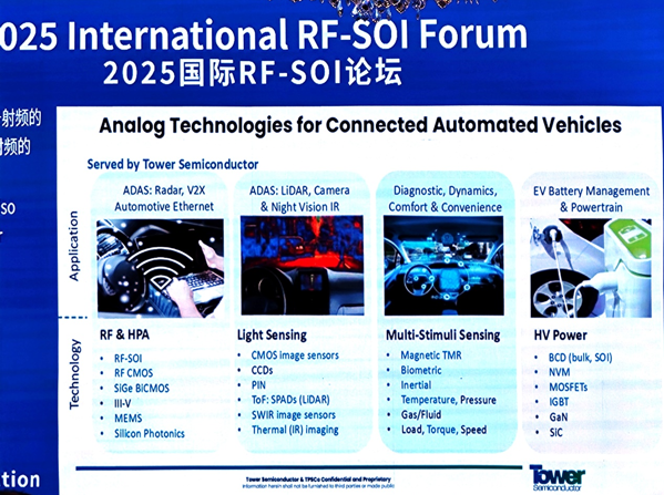 值得关注的是,Tower Semiconductor 还将 RF SOI 技术及模拟技术矩阵拓展至智能网联汽车领域,打造“模拟技术赋能智能网联汽车”的专属解决方案。在应用场景上,该方案覆盖ADAS、EV电池管理、动力系统、车载舒适便利功能及汽车以太网等核心环节;在技术支撑上,除核心RF SOI外,还整合了RF CMOS、SiGe BiCMOS、BCD、GaN、SiC、MEMS及硅光子学等技术,并配套磁TMR传感器、生物识别传感器、惯性传感器、ToF用 SPADs、SWIR图像传感器等组件,构建起覆盖汽车“感知-通信-动力-控制”全链条的技术支持体系。