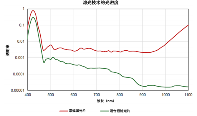 采用新型混合银滤光片(绿色曲线)的最新艾迈斯欧司朗ALS 产品,其阻带抑制能力较早期传感器(红色曲线)提升10 至 1000 倍