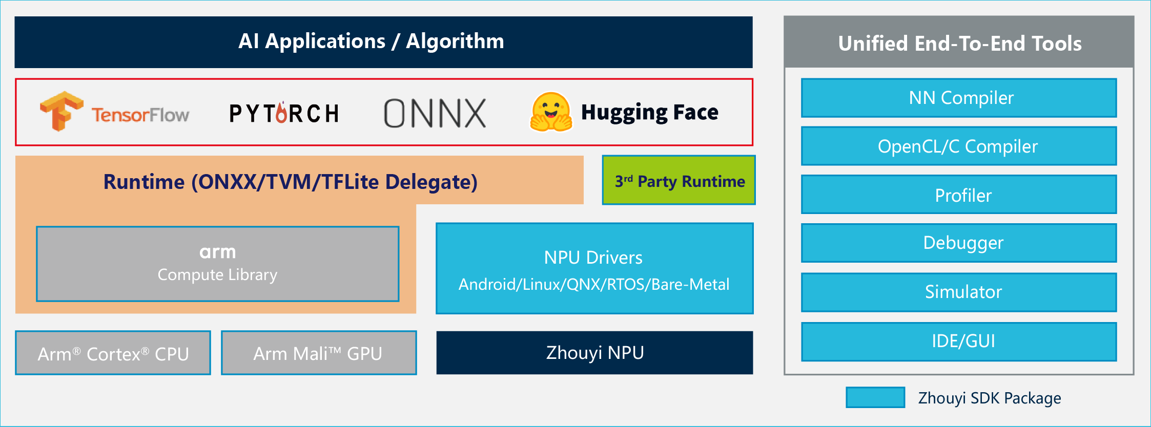 “周易”NPU不仅可以提供高性能的硬件支持,还配备了易用、完善的Compass软件平台,可提供丰富的调试工具与软件仿真平台,全面支持多种主流AI框架、操作系统及开放接口。该平台对大模型部署进行了深度优化,已实现对Llama、Qwen、DeepSeek、ChatGLM及MiniCPM等主流模型的成熟支持,并提供与Hugging Face模型库的对接工具链,可显著提升模型部署效率。通过持续且大规模的软件投入,“周易”NPU不断扩充算子库并完善自定义算子开发工具链,以开放、灵活的软件架构应对未来多样的算法演进需求,为合作伙伴打造“开箱即用”的端侧AI开发体验。