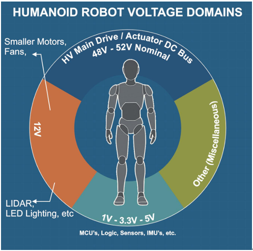值得关注的是,“在人形机器人领域,48V已成为主流安全电压方案,覆盖从主驱动总线到电池供电的核心环节。”瞿松指出,人形机器人的电压域以48V-52V为主驱总线,搭配12V(手部电机、冷却风扇)、1-5V(传感器、MCU)等多级架构,既满足动力系统的功率需求,又通过DC/DC转换器实现安全高效的电压分配。