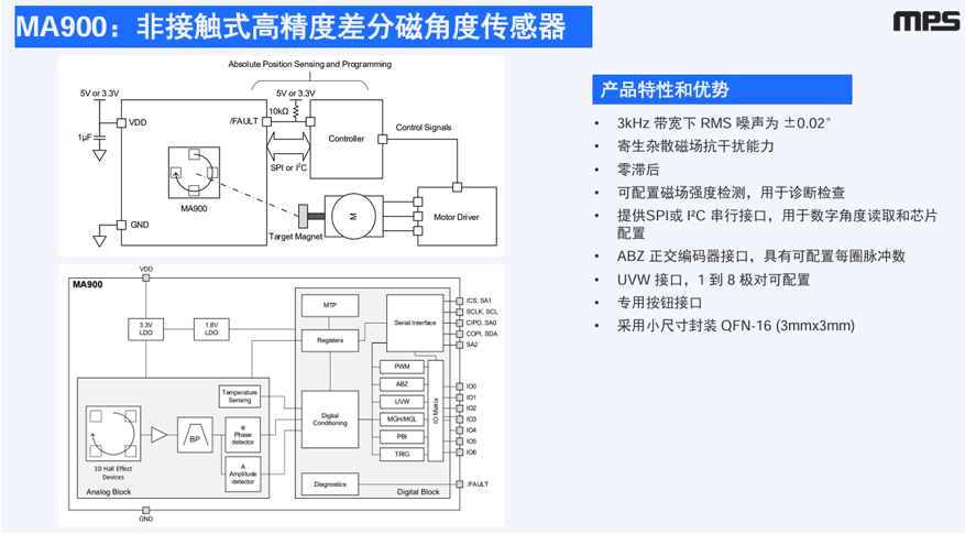 针对机器人内部多电机杂散磁场干扰的痛点,MPS的MA(Q)900采用基于霍尔的差分传感技术,通过传感器IC多位置磁场差异提取角度数据,可抵御超过4kA/m DC或5mT的寄生杂散磁场,实现零滞后、高精度的角度测量。其无噪声分辨率达10-14位,3kHz带宽下RMS噪声仅±0.02°,工作电压覆盖3.0V-3.6V与4.5V-5.5V,通信接口支持SPI、I²C、ABZ、PWM等多种协议,还具备可配置磁场强度检测功能,便于系统诊断。封装提供QFN-16(3mm×3mm)与QFN-32(5mm×5mm)两种选择,同时符合AEC-Q100、ASIL-B/D等车规与功能安全认证,在工业机器人、汽车转向系统等场景均有出色表现,尤其为人形机器人在复杂电磁环境下的稳定运行筑牢了感知基石。