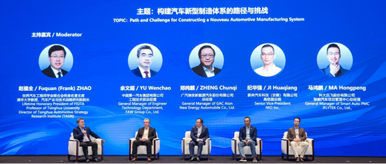 作为数智大会主论坛的品牌栏目,本届大会高层对话以“构建新型制造体系的路径与挑战”为主题。由世界汽车工程师学会联合会终身名誉主席、清华大学教授赵福全任主持嘉宾,中国第一汽车集团有限公司工程技术部总经理余文超、广汽埃安新能源汽车股份有限公司总经理郑纯麒、蔚来汽车科技(安徽)有限公司高级副总裁纪华强、科大讯飞股份有限公司智能汽车项目管理中心总经理马鸿鹏参与对话交流。对话活动围绕企业开展多主体协同创新的实践与挑战、AI+创新场景在汽车智能制造全环节的实践分享与落地挑战、汽车智能制造行业标准体系的需求与瓶颈、中国汽车智能制造面向中长期发展愿景呈现了一场精彩纷呈的思辨盛宴。