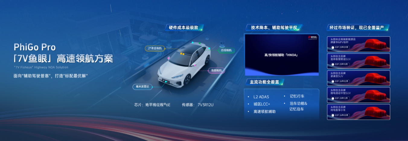 基于地平线征程®6E的PhiGo Pro高速领航组合辅助驾驶解决方案,以"智驾全面普惠"为理念,实现了高速/城区全覆盖、通用障碍物识别、功能多合一,真正做到"油电同智"。该方案以鱼眼复用的简洁高效传感器配置,集成行泊一体、城区LCC+、记忆行车、主动安全等多项主流辅助驾驶功能,具备高安全、高可靠工程成熟度。此外,方案采用被动散热,实现“油电同智”,支持各种动力形式车型的规模量产需求。方案致力为行业树立高速领航辅助量产新标杆,目前,该方案已实现征程6E方案的量产首发,并持续获得多家车企爆款车型的量产订单。