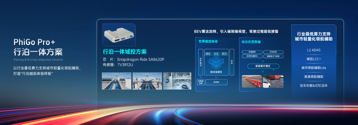 "基于高通Snapdragon Ride™平台(SA8620P)的PhiGo Pro+中算力行泊一体解决方案行泊一体方案通过BEV算法加持,引入端到端模型,实现了驾驶过程的超低接管率。"程鹏强调,"该方案可以行业最低算力支持城市NOA Lite功能,体现出四维图新在算法优化方面的深厚积累。"