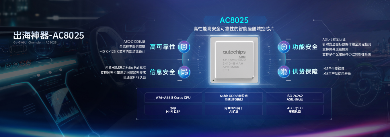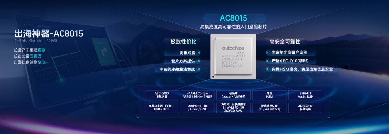 AC8015/AC8025座舱域控成为出海战略的“技术锚点”。这套方案不仅实现成本优化10%-20%,更以“一套硬件兼容全球”的理念,破解了车企出海面临的区域适配难题。