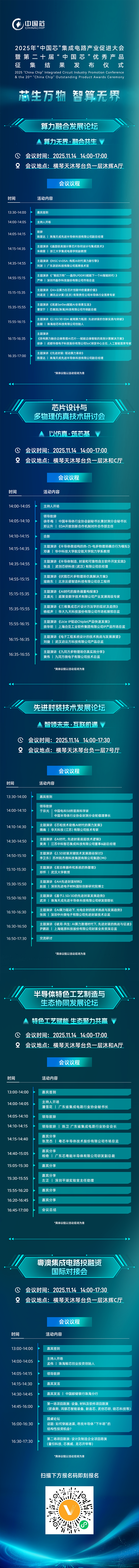 产业的思想碰撞与深度聚焦,藏在各具特色的分论坛中。本届大会设置算力融合发展论坛、芯片设计与多物理场仿真技术研讨会、先进封装技术发展论坛、半导体特色工艺制造与生态协同发展论坛、粤澳集成电路国际投融资对接会五大专业分论坛,议题覆盖从设计、制造、封装到投融资等核心环节。强烈建议收藏下方议程,一键锁定精彩。