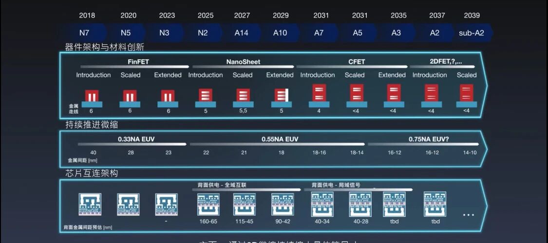 能看到,未来15年,芯片制程将从3nm、2nm向A14、A10以及更先进的埃米节点演进,芯片架构也将沿着FinFET、NanoSheet、CFET到2DFET的方向持续迭代,以及金属间距、互联架构和供电方式等创新技术随之快速发展。