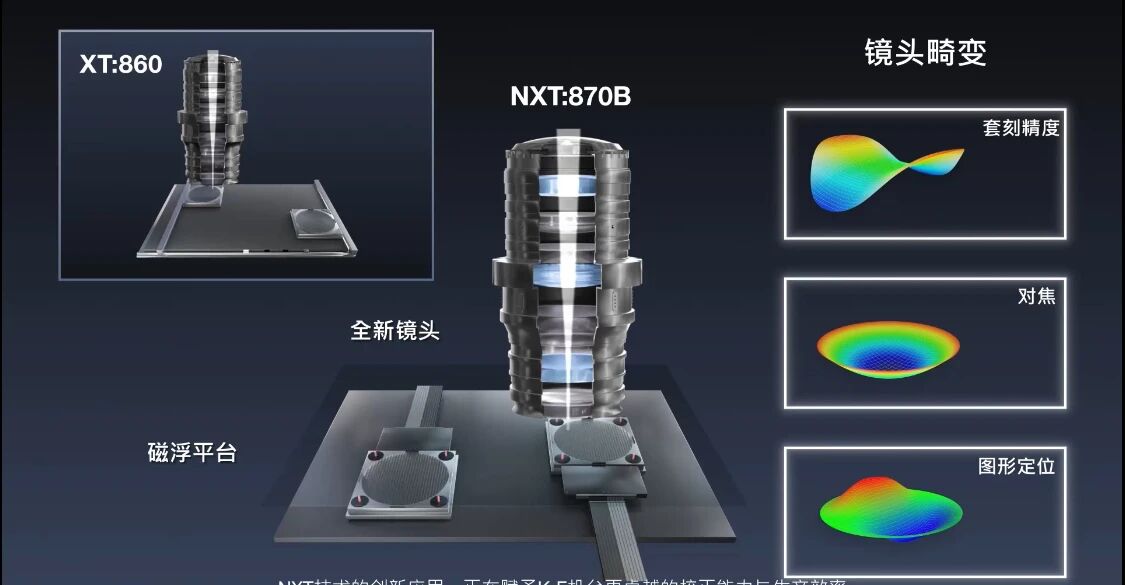 ASML在DUV领域的技术积累同样深厚,其DUV设备通过持续创新,在生产力、套刻精度与工艺适应性上形成显著优势,成为支撑光刻效率与质量的核心力量。以本届进博会上展示的TWINSCAN NXT:870B光刻系统为例,在升级的光学器件和最新一代磁悬浮平台的支持下,NXT:870B可将晶圆吞吐量提升至≥400 wph的新高度,并通过多方面技术优化实现性能突破,为键合后的套刻和阶梯式工艺提供强大的校正能力。