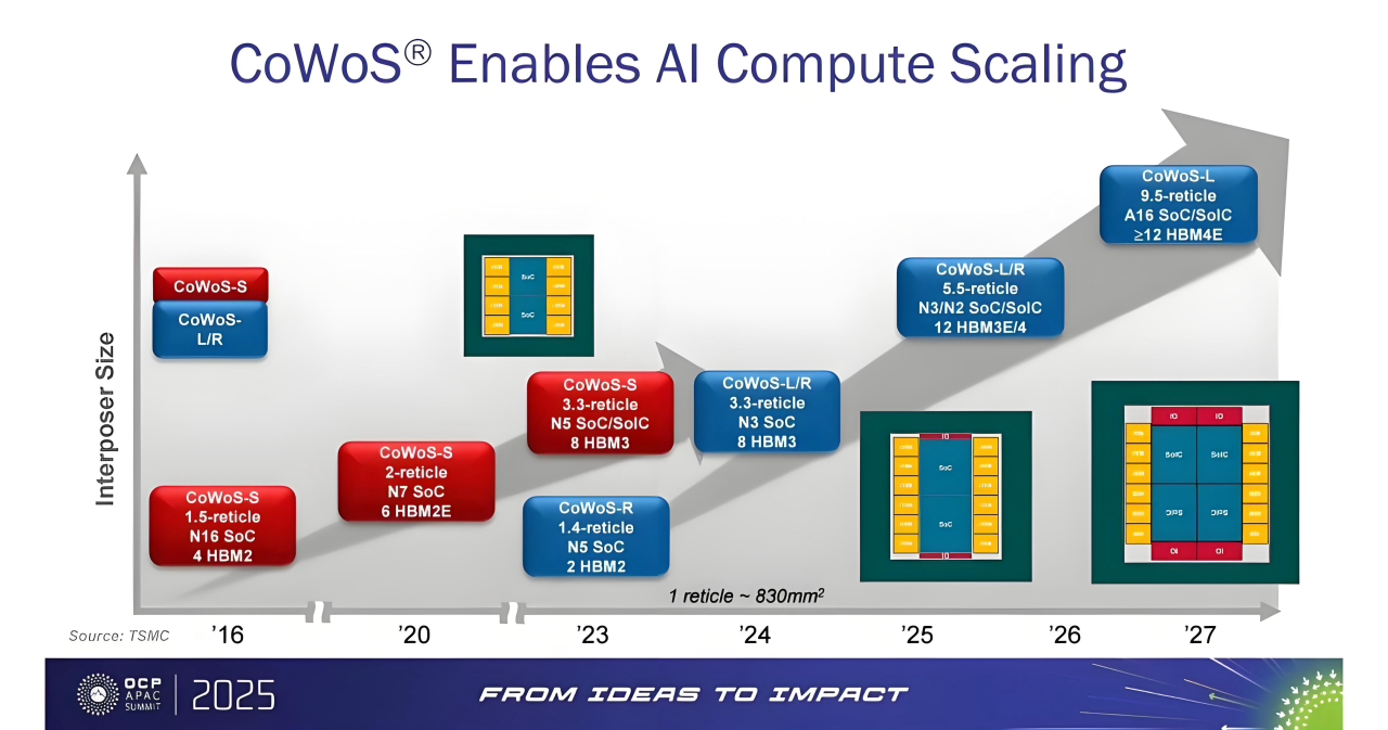 另一边,在AI芯片强劲需求的推动下,以台积电CoWoS为代表的先进封装技术正迅速崛起,成为延续算力增长的关键路径。