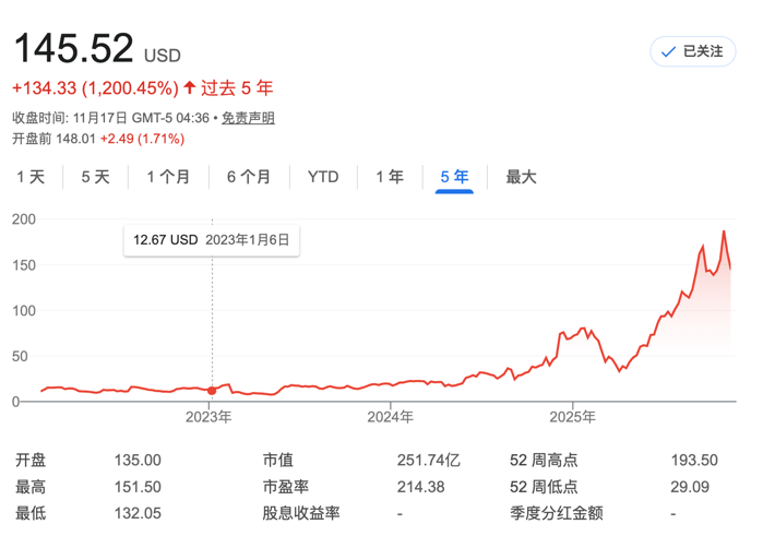 从股票市场看,截止笔者撰稿为止(2025年11月17日),如下图所示,自2022年1月上市以来,该公司的股价已经暴涨超1200%;过去一年,该公司股票上涨也超过250%;如果只统计今年至今的股票走势,他们市值也翻倍,增长幅度超过100%。