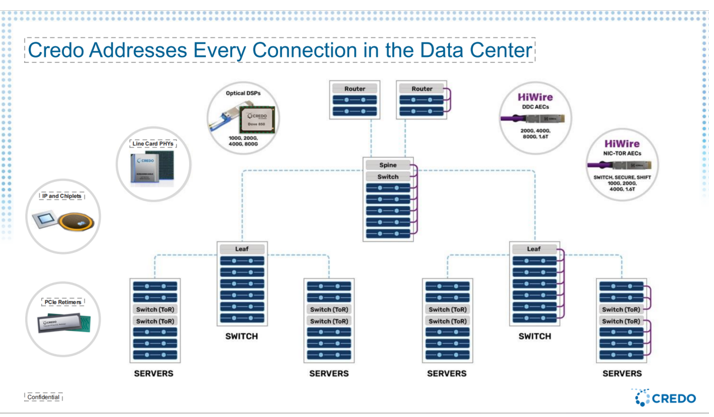 以上就是这家名为Credo的公司在过去几年的市场表现。管中窥豹,能获得这样的表现,主要归功于该公司在技术方面的持续创新与过硬的产品实力,其中包括与人工智能基础设施密切相关的有源电缆 (AEC) 所占据的领先市场地位及其灵活且全面的光学DSP 解决方案。