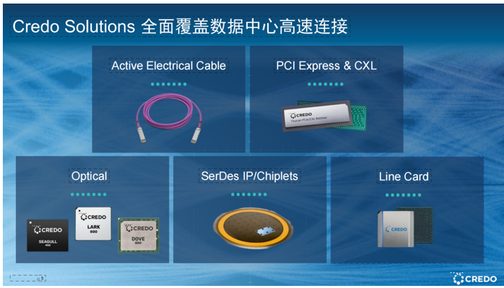历经多年的发展,Credo开发出了AEC、PCI Express & CXL、光学、SerDes IP/Chiplets和Line Card五类产品。其中AEC是由Credo在2018年正式发布的独创产品,能解决机架内及跨机架的短距离服务器及交换机之间的100G、200G、400G、 800G及以上互联的问题。