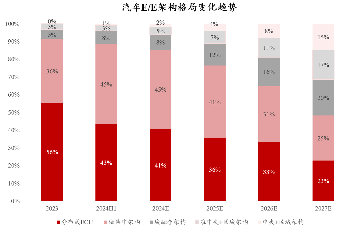 这场变革背后,是汽车电子电气架构(E/E)的根本性革新。传统分布式架构下,车辆各系统独立控制、线束繁杂,已难以承载当前软件定义汽车(SDV)带来的海量数据处理与跨域协同需求。“中央计算+区域控制”的新型架构应运而生,将分散的控制功能整合,通过区域控制器实现多域融合管理。