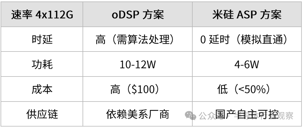 米硅科技全球首发的4×112G ASP (CDR) 电芯片,开辟全新替代路径—直接取代oDSP+Driver+TIA的复杂方案,为光模块厂商提供集成度更高、成本更低、功耗更优的解决方案。其战略意义在于: