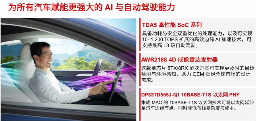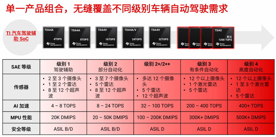 面对L3级自动驾驶对算力的数百TOPS级需求,TI推出的TDA5高性能计算SoC系列实现了10-1200 TOPS的灵活算力覆盖,能效比突破24 TOPS/W,达到行业领先水平。