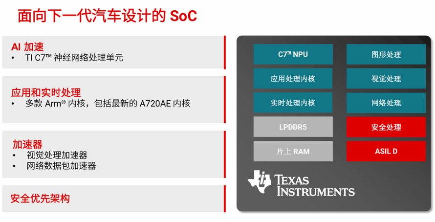 这一核心优势源于其深度优化的硬件架构:集成TI第七代C7™神经处理单元(NPU),专为ADAS场景定制,相比前代产品AI算力提升12倍,且无需依赖昂贵的液冷散热系统,仅通过风冷或被动散热即可稳定运行。