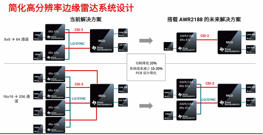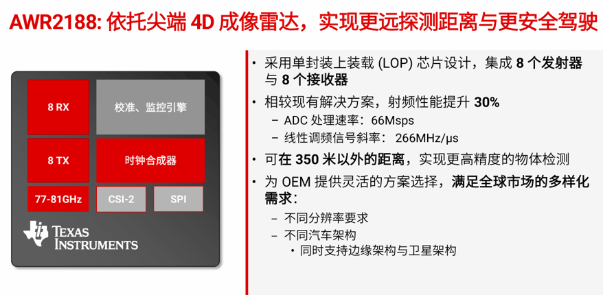 作为高阶自动驾驶的“全天候眼睛”,TI全新AWR2188 4D成像雷达收发器以单芯片集成8个发射器与8个接收器的创新设计,打破了传统雷达需多芯片级联才能实现高分辨率探测的行业痛点。