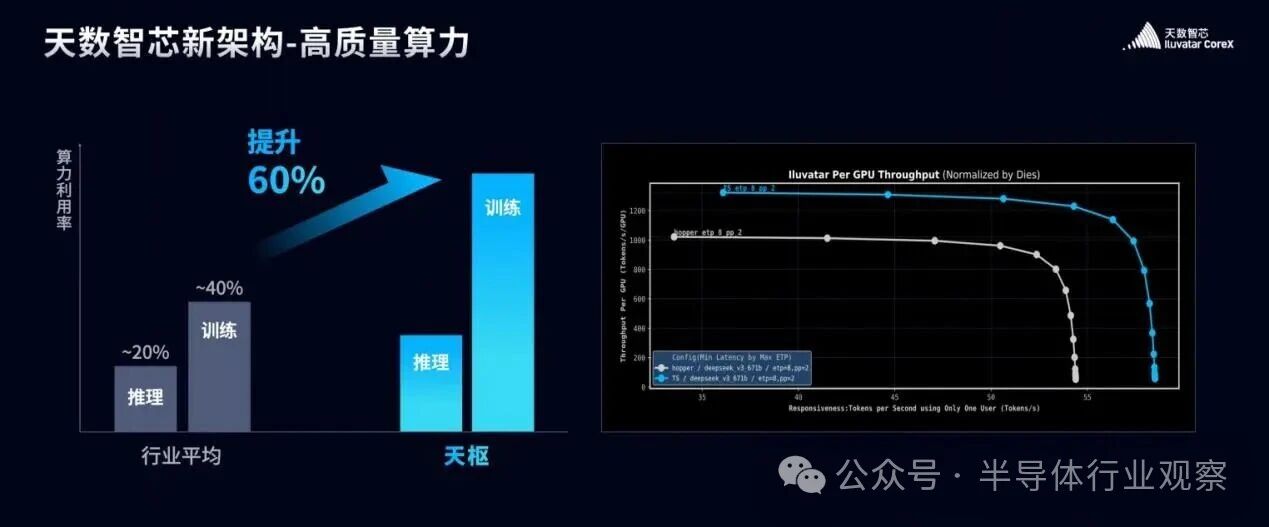 据介绍,通过采用 SIMT 架构,天数智芯在算子上实现了极高的硬件利用率;借助通算融合与流水线并行等“扬长避短”策略,天数智芯方案的吞吐量与首词延迟在 DeepSeek R1 等大模型场景下的表现优于 A800,这展现出深度的软硬件协同优化能力与强劲的国产算力实战价值。(具体参考文章《ByteMLPerf 实测:天数智芯 GPGPU 全链路技术解析,创新释放高效算力》)