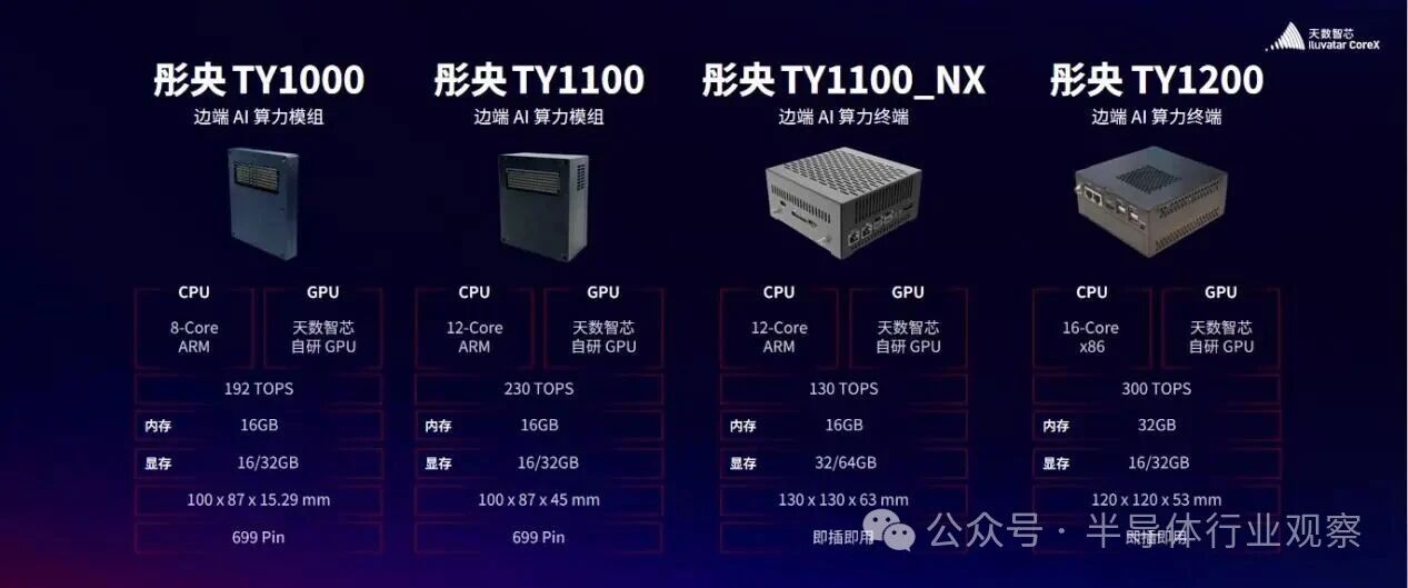 据介绍,此次发布的四款产品形态各异、各有侧重。其中,彤央 TY1000 算力模组采用 699pin 接口,以口袋大小集成行业级算力与开放生态,实现便携化部署;彤央 TY1100 算力模组集成ARM v9 12核CPU 与自研GPU模组,以充沛算力提供多元选择;彤央TY1100_NX 算力终端凭借更大显存成为高性价比之选,堪称边端算力“小钢炮”;彤央TY1200 算力终端则以 300TOPs 的极致性能与小巧身材,为 AIPC、具身智能等前沿场景提供核心支撑。