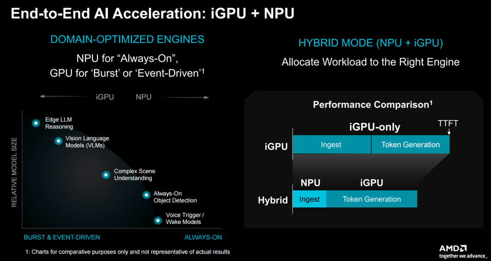 如上所述,和此前发布的P100系列一样,AMD在新发布的系列处理器上依然集成了NPU。在AMD看来,这个由“iGPU+NPU”组成的端到端AI加速器能够根据需要将工作负载分配给合适的引擎,更好地平衡芯片的功耗和性能。