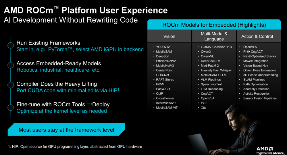 由此可见,除了性能优越的硬件外,软件也是一个产品能否征服客户的另一个关键指标。这也恰好也正是AMD一直深耕的方向。AMD也表示,得益于对 AMD ROCm 开放软件生态系统的支持,公司为嵌入式应用带来了一套业经验证的开源 AI 软件栈。开发人员可以在依赖开源编译器、运行时和库的同时运行标准 AI 框架,并且无需重写代码即可即时访问适用于嵌入式的模型。在编程层面,ROCm 软件采用开源的 HIP (Heterogeneous-computing Interface for Portability),将 GPU 编程从硬件中解耦,消除了软件栈和硬件之间的供应商锁定。