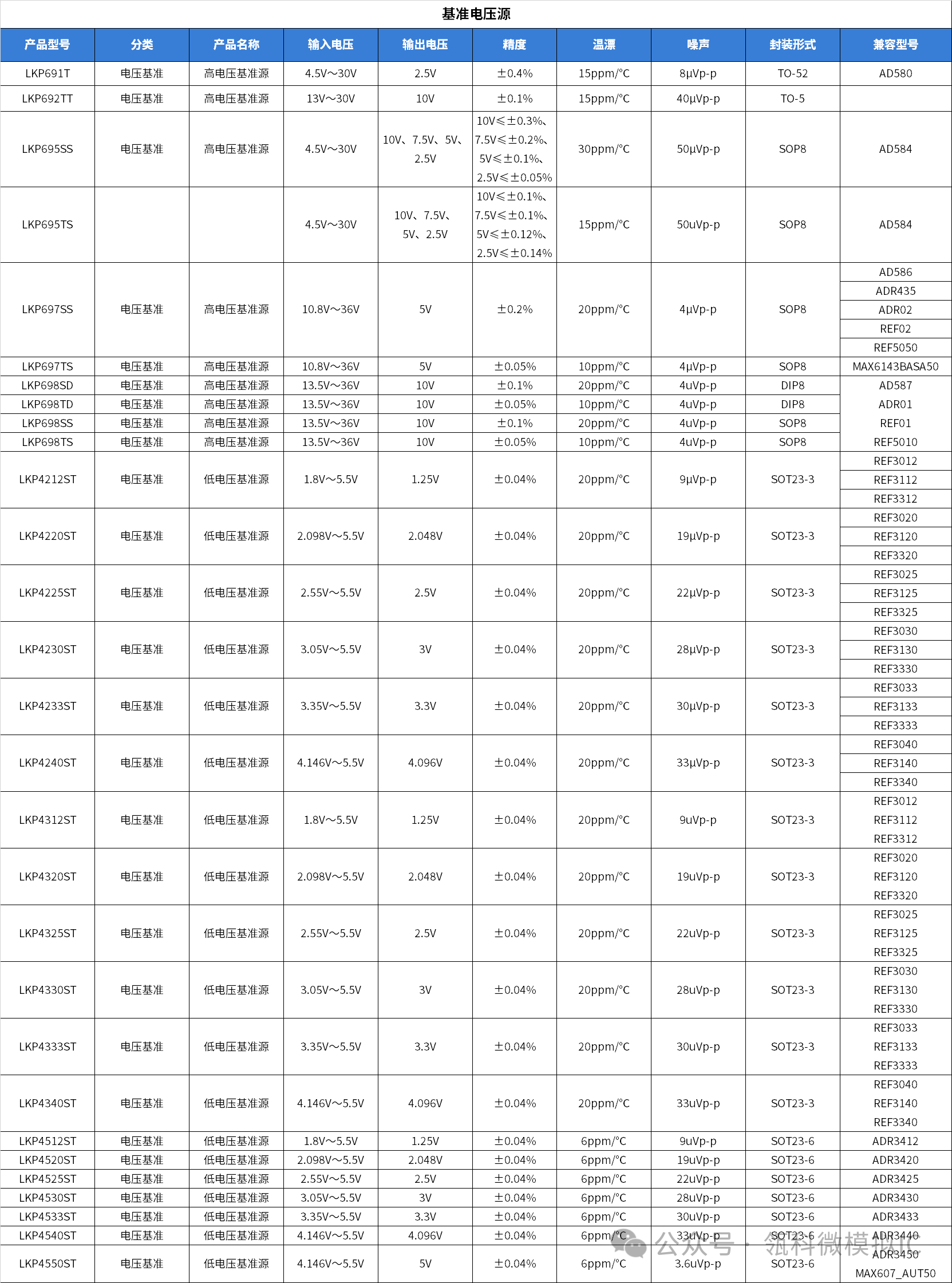 瓴科微提供覆盖高电压、低电压、通用型及高精度型的全系列电压基准源,满足不同系统对输出电压、精度、功耗及封装的要求。例如,LKP695TS支持多电压输出(10V/7.5V/5V/2.5V),可直接兼容AD584;LKP698TS提供10V输出,温漂低至10ppm/℃,适用于对精度要求较高的工业与医疗设备。