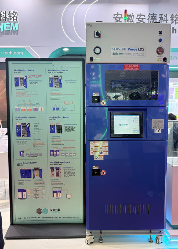 在本次SEMICON China上,安德科铭发布了自主研发的新款LDS设备——具备溶剂清洗功能的ADC500机型。整机分为上下两部分:上部为控制器,内置 PLC 控制模块及电控组件;下部柜体为机械结构,内部布有密集管路、气动阀门及压力表等元件。柜体下方设有五个钢瓶,分别为前驱体源瓶、缓冲瓶A、缓冲瓶B、溶剂源瓶和溶剂回收瓶。此外,设备顶部与底部还装有安全侦测部件,可在化学品泄漏、火灾等异常情况下及时报警并启动连锁保护装置。
