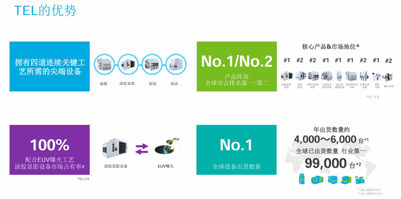 TEL中国区市场副总裁倪晓峰指出:“在全球前道晶圆制造的核心工艺循环中,除了光刻机,TEL几乎都能提供具备竞争力的设备。”数据显示,TEL的涂胶显影设备全球市占率达92%,其中EUV配套涂胶显影设备更是占据100%的市场份额。此外,刻蚀、成膜、清洗等核心工艺设备均位列全球第一或第二,形成“四大核心工艺全覆盖、十大产品线均居全球前二”的绝对优势。截至2025年12月,TEL全球累计出货设备已达99000台,客户端装机量与覆盖度位居全球第一。
