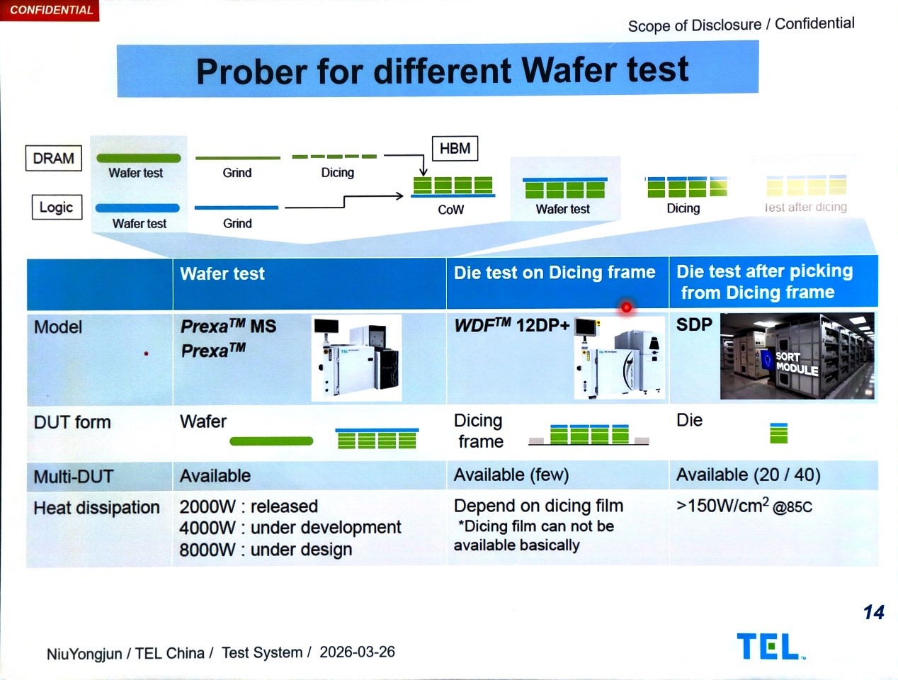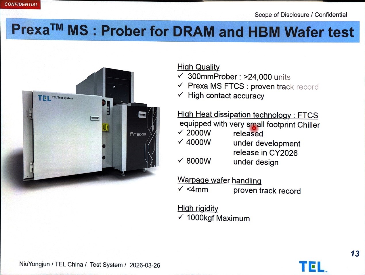 其中Prexa MS是专门针对HBM和Memory测试开发的型号,根据存储器测试的特殊要求进行了专门优化。例如针对HBM测试中突出的发热问题,TEL推出了FTCS(全晶圆热控方案),目前已可有效控制2kW发热量,4kW规格产品预计在2026年内上市,最高可覆盖8kW需求。
