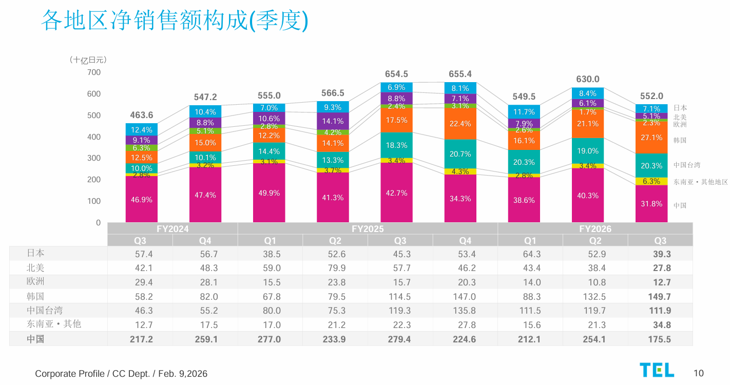 中国市场在TEL全球业务版图中始终占据重要地位,近年来的销售占比一直占据高位,长期稳居公司第一大单一区域市场。即便在全球区域结构调整背景下,中国区销售额仍相当于公司总营收的三分之一,2026财年第三季度销售额占比达31.8%,规模远超其他区域。