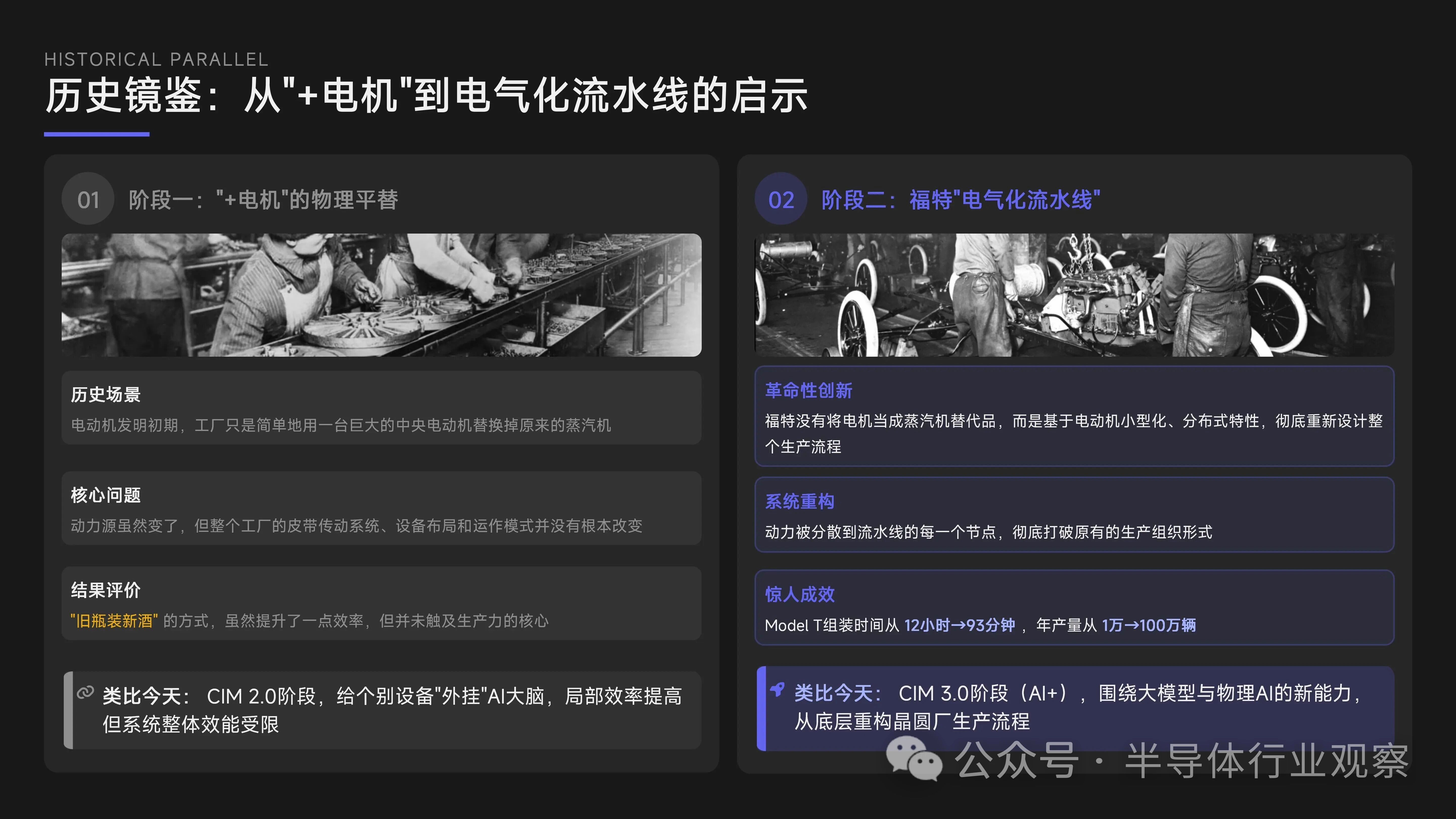 真正的工业智能化,必须像福特重构汽车工业一样,围绕大模型与物理 AI 的新能力,打破设备间的信息孤岛,从底层重新设计整个晶圆厂的生产流程与软件架构,让“智能”流淌在每一道工序的血液中。